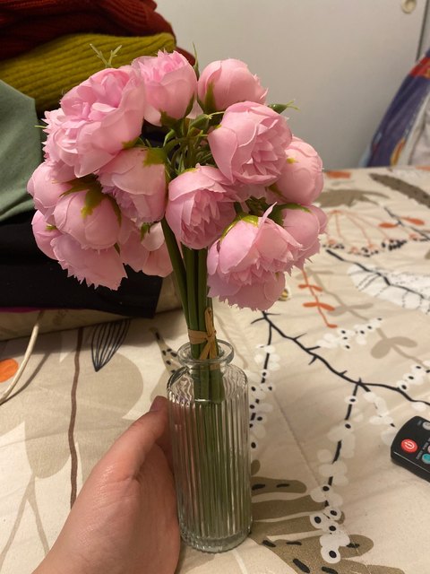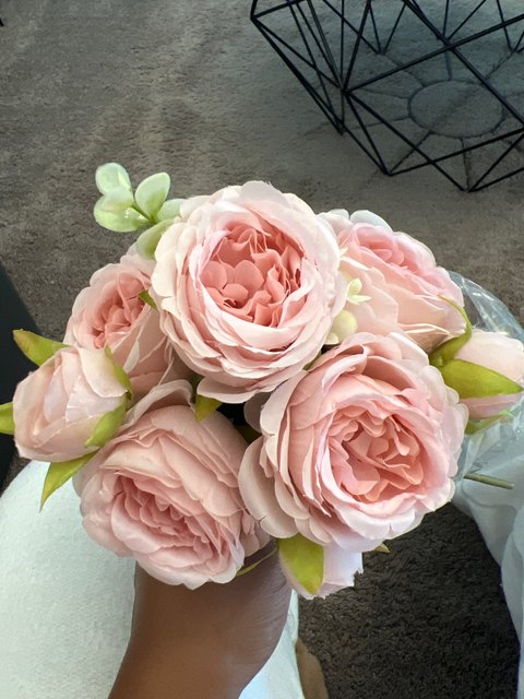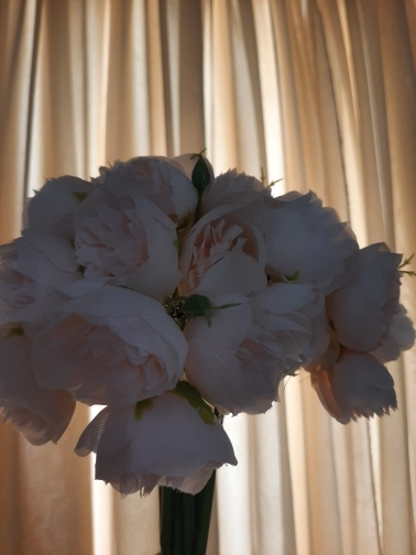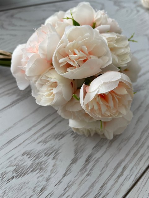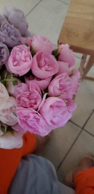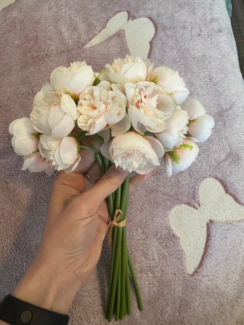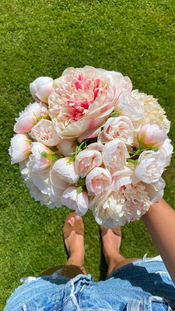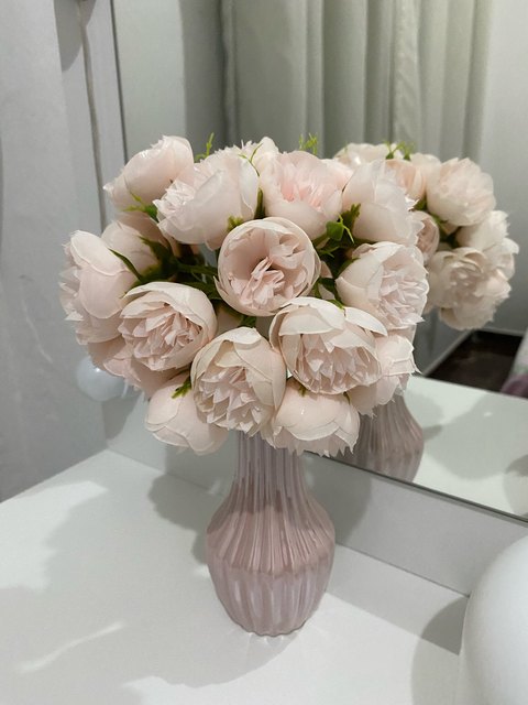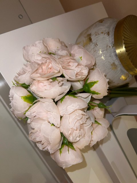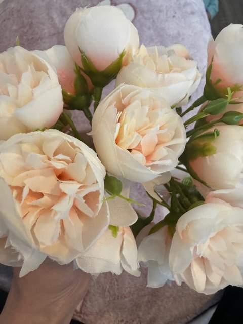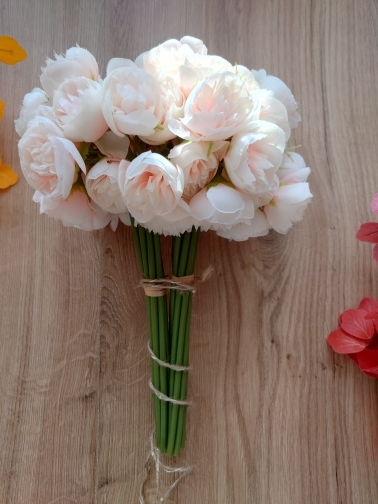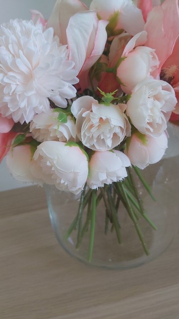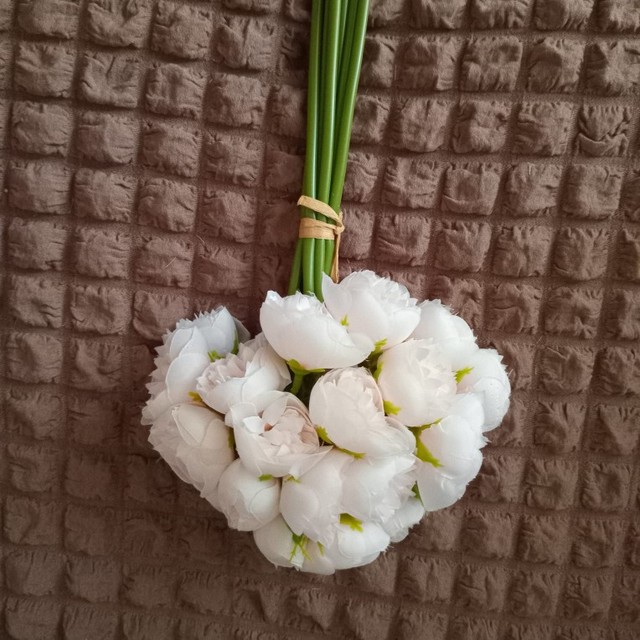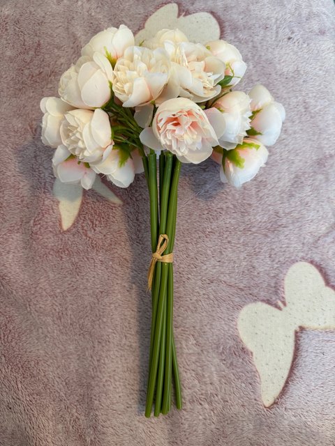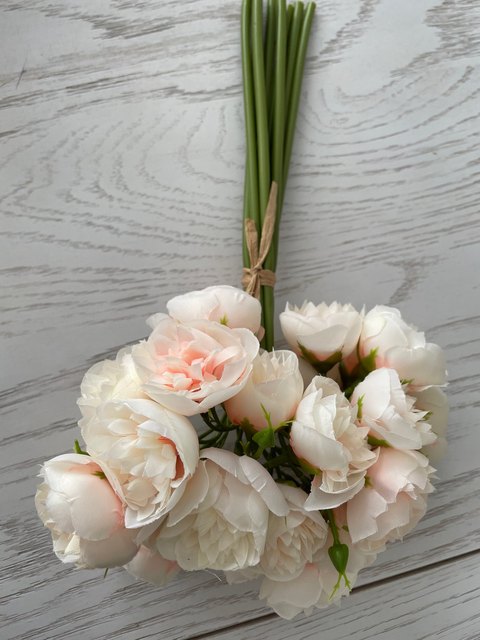 Joli bouquet de pivoines artificielles sur tiges. Arrivées un peu écrasées mais se remettent facilement en place.