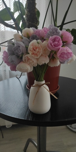 Дуже гарні квіти, я замовила 3 кольори, склала 2 букети. Попередньо прогріла феном гарячим повітрям, щоб розправились. Дуже задоволена)